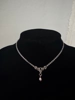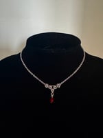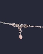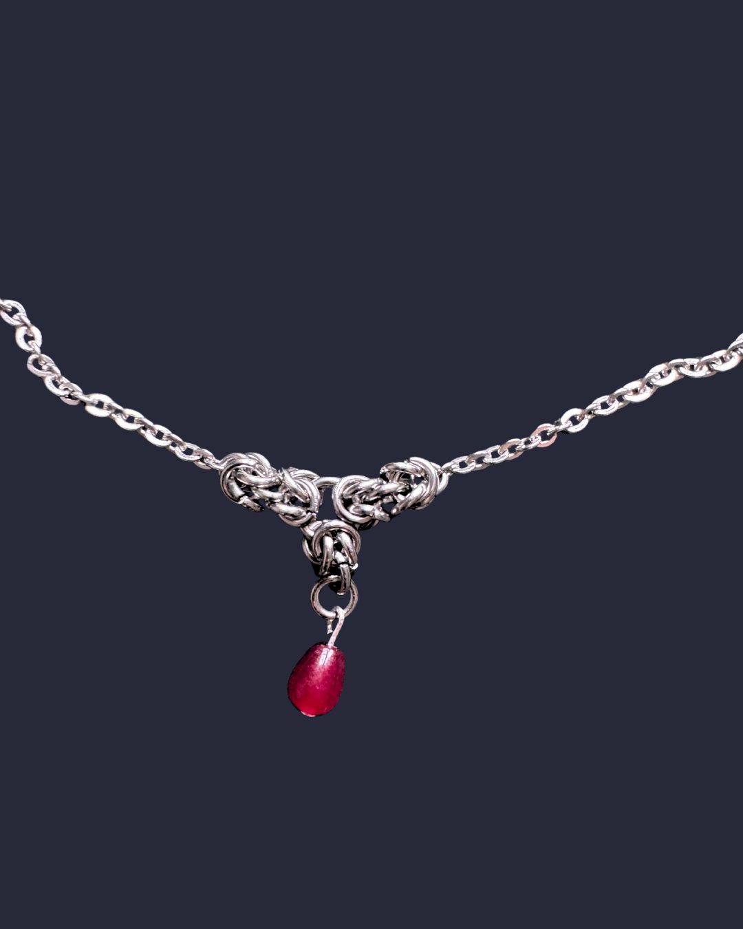 Tiny 5mm stainless steels links woven into a byzantine design with a red chalcedony or pink pearl to finish