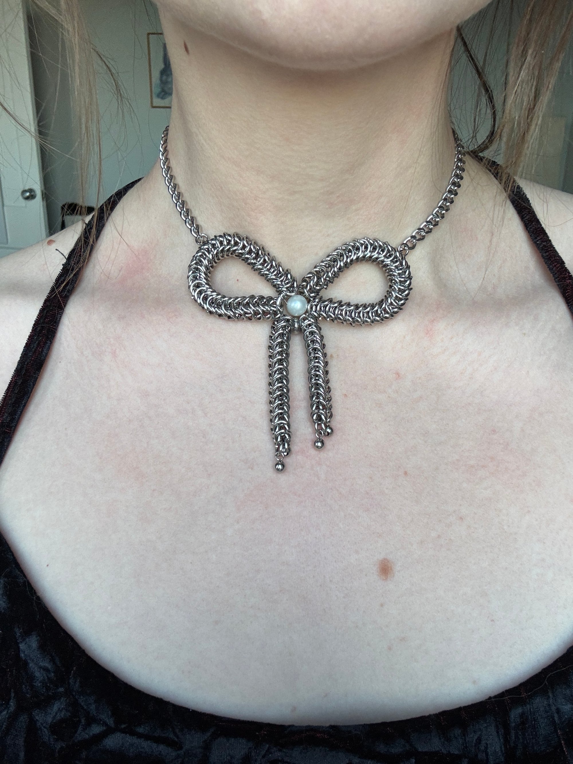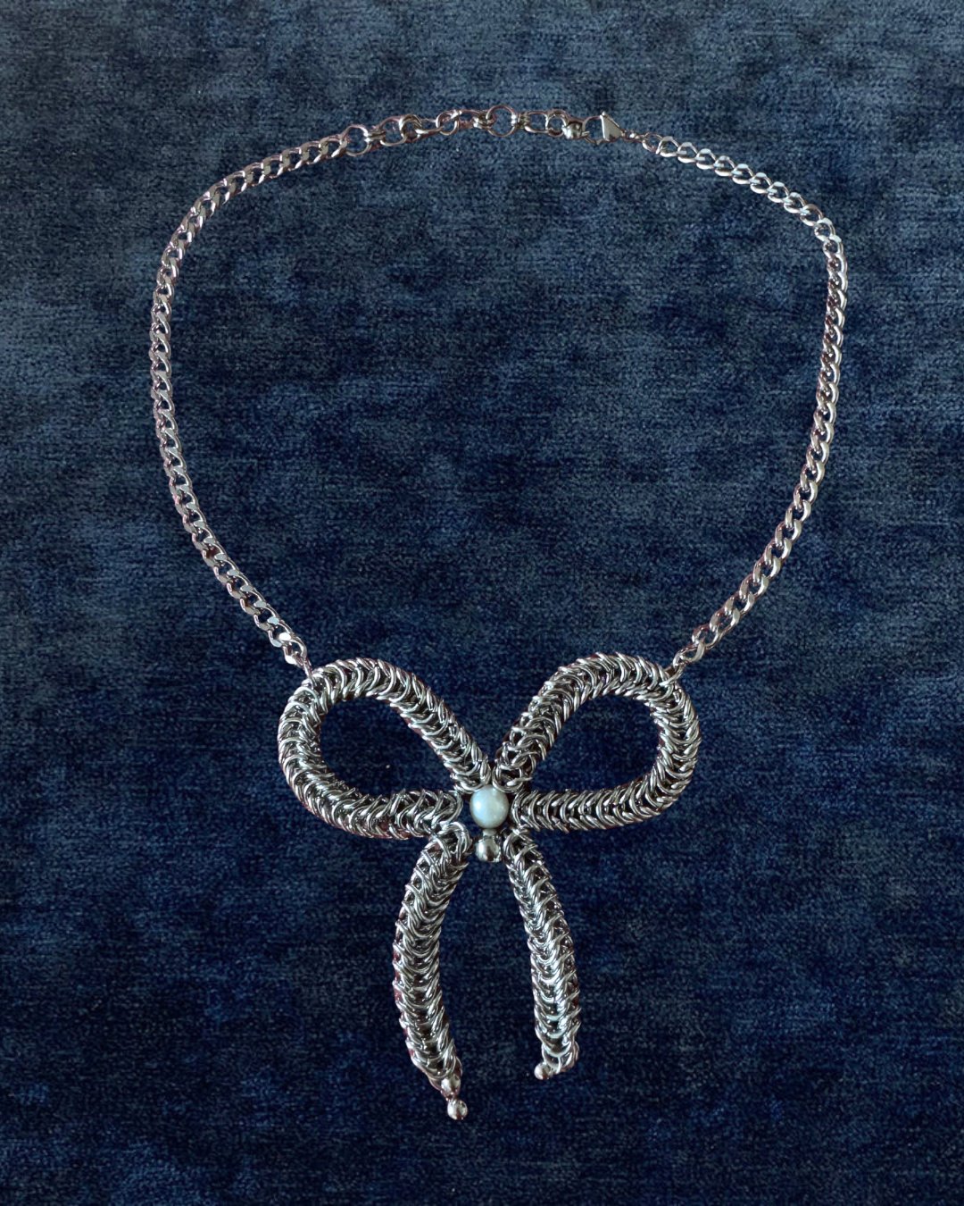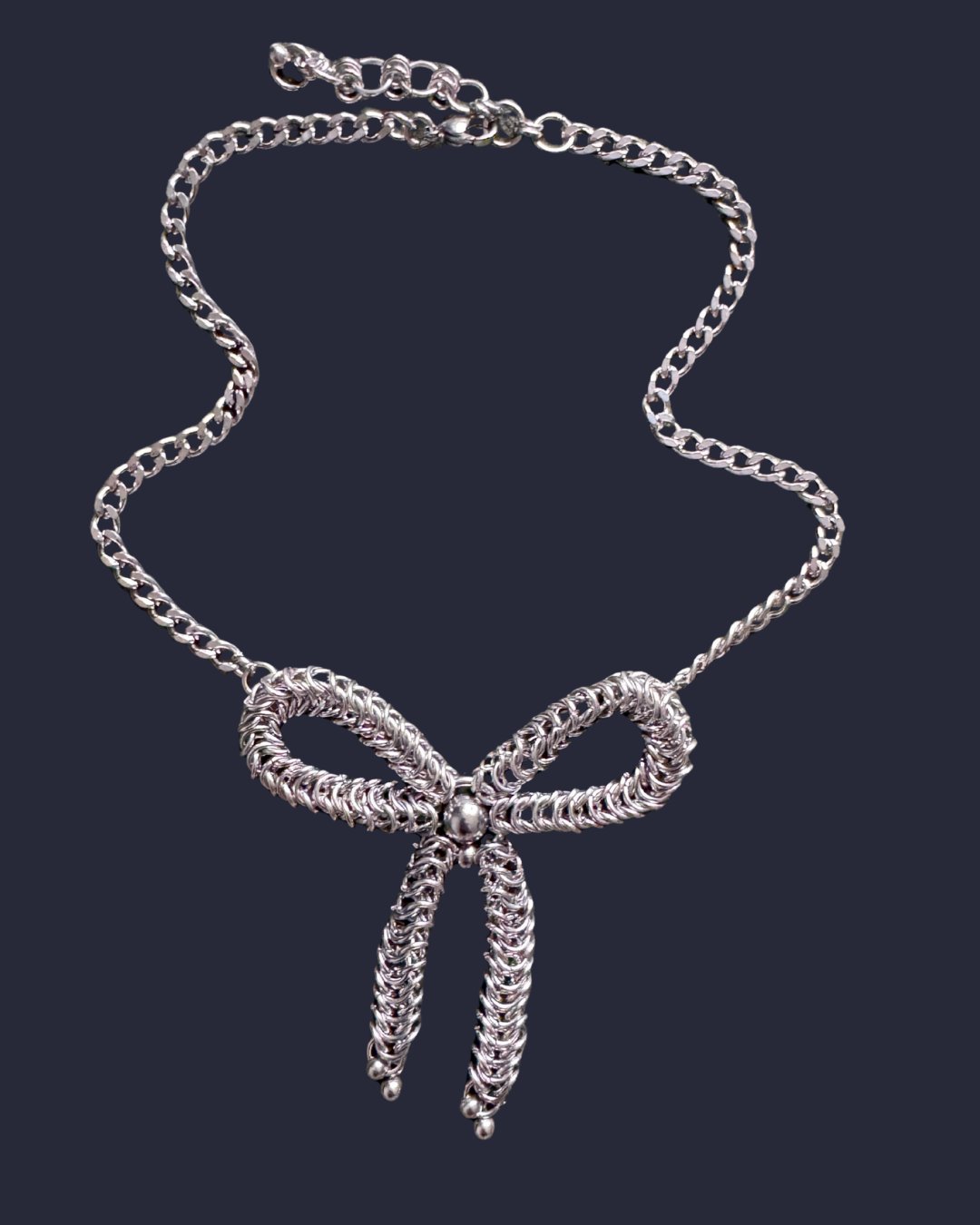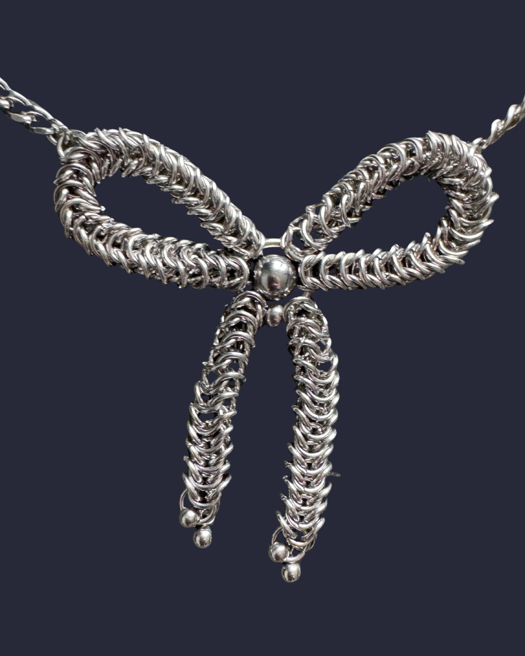 6mm stainless steel links woven into a bow on a 16mm hoop with silver spacer bead detail.