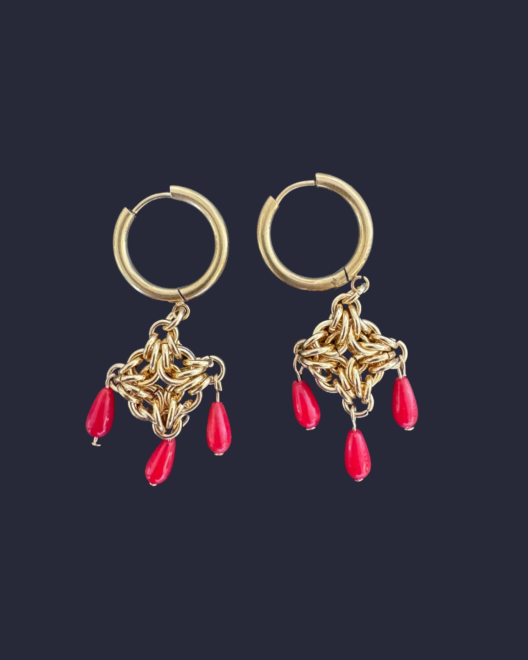 3 different sizes of gold plated jumprings woven into a byzantine diamond with coral beads