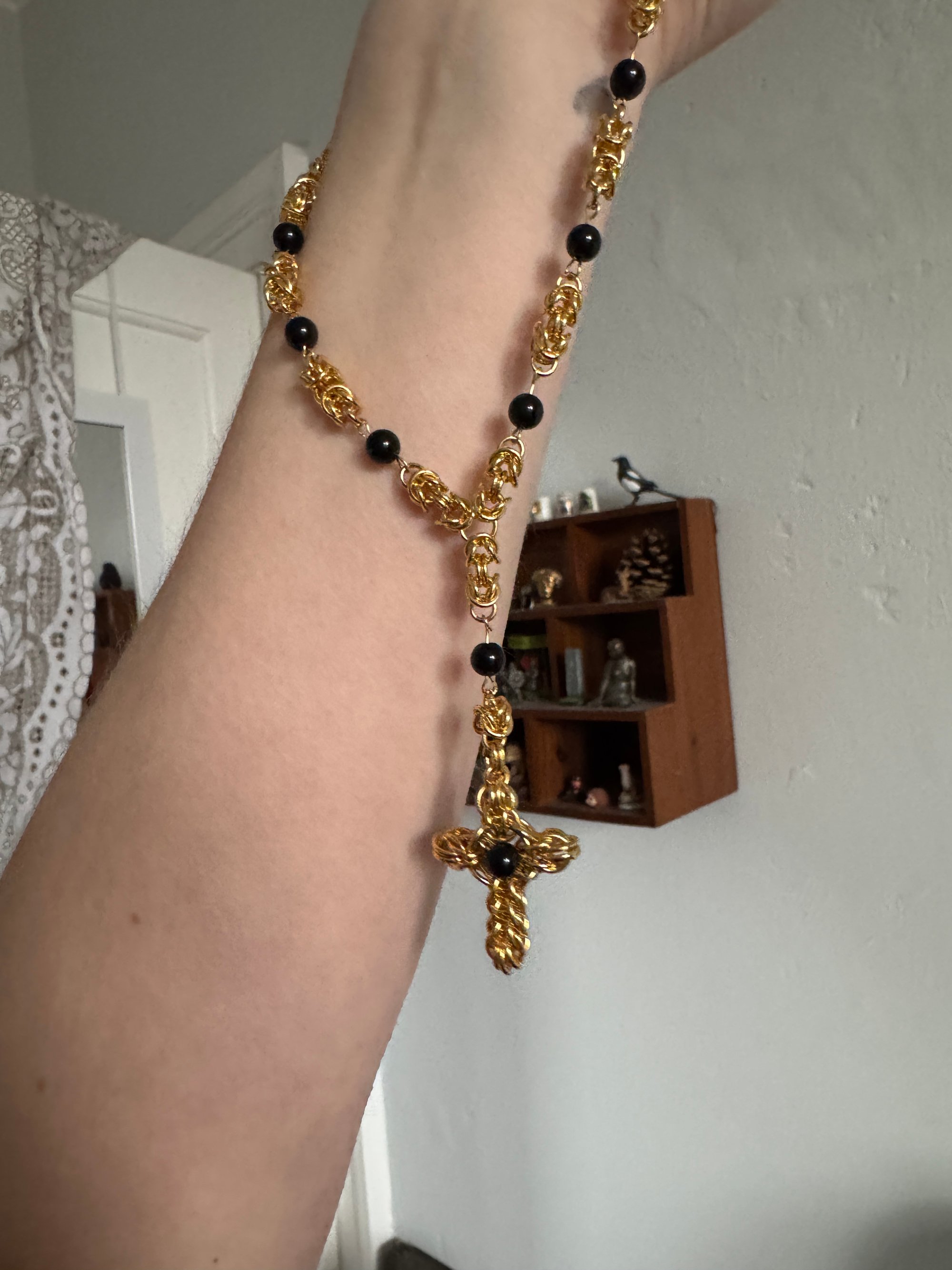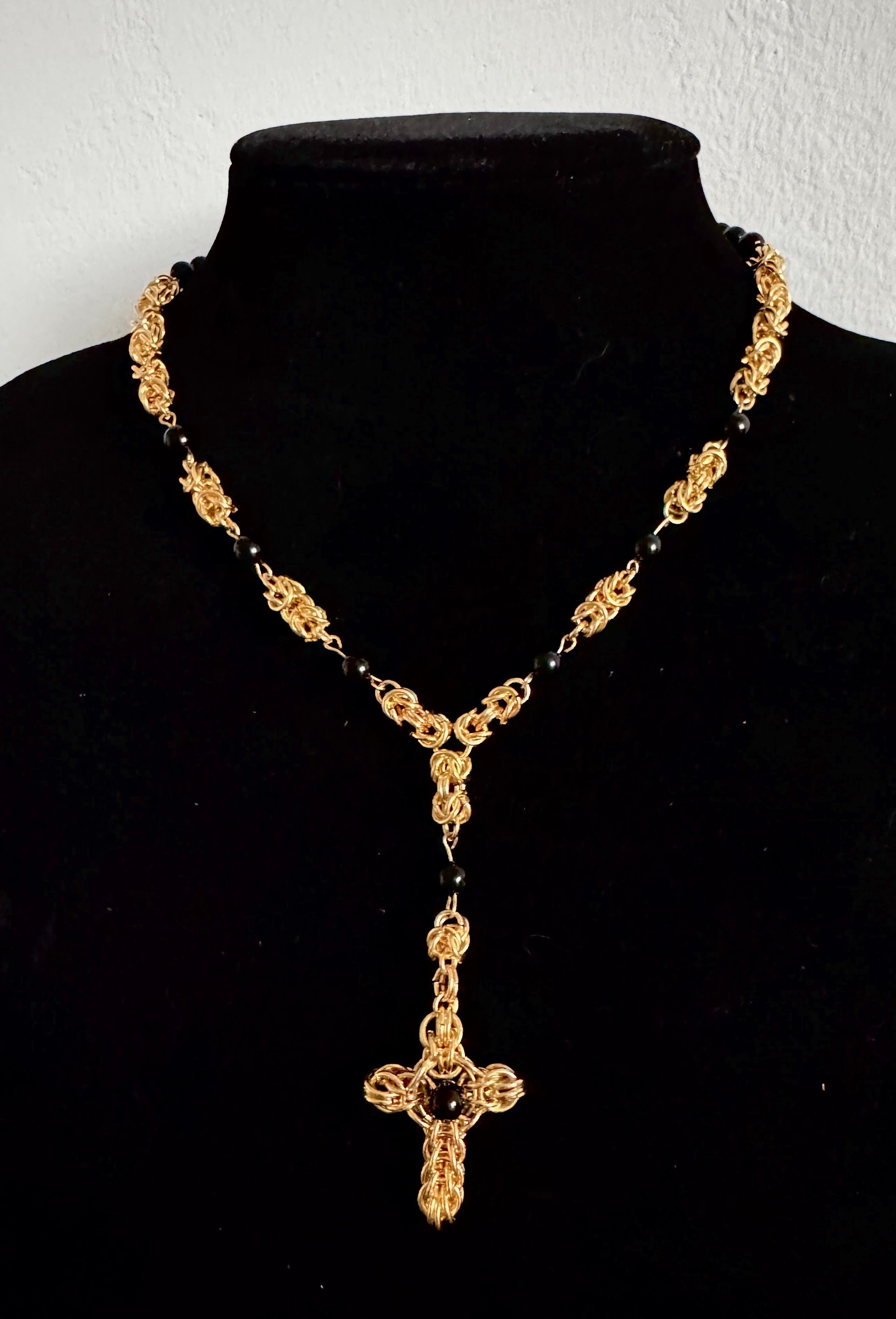 Gold plated 6mm jumprings woven into a byzantine design, with celtic cross pendant and onyx bead detail