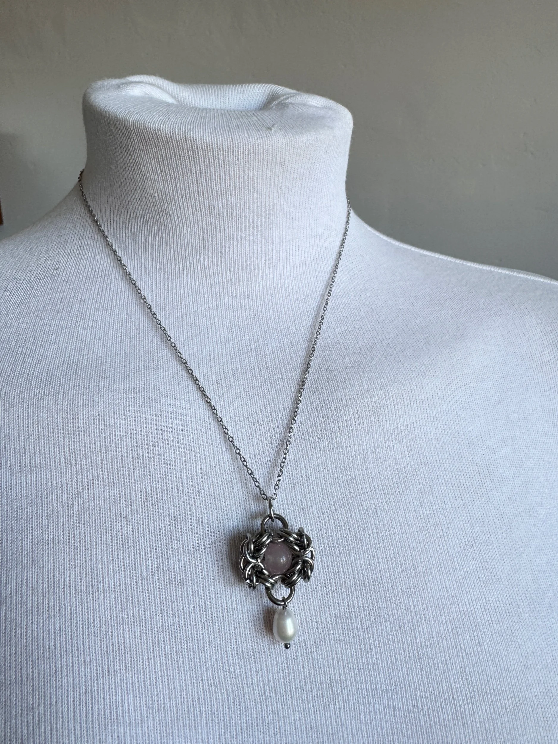Shop › Rose Quartz and Pearl Charm Necklace Image 1 of 2 Image 2 of 2 Rose Quartz and Pearl Charm Necklace £15.00 Rose quartz bead wrapped in steel byzantine with a freshwater pearl drop Chain length 17.5cm2 available Add To Cart Added! Rose quartz bead wrapped in steel byzantine with a freshwater pearl drop Chain length 17.5cm2 available