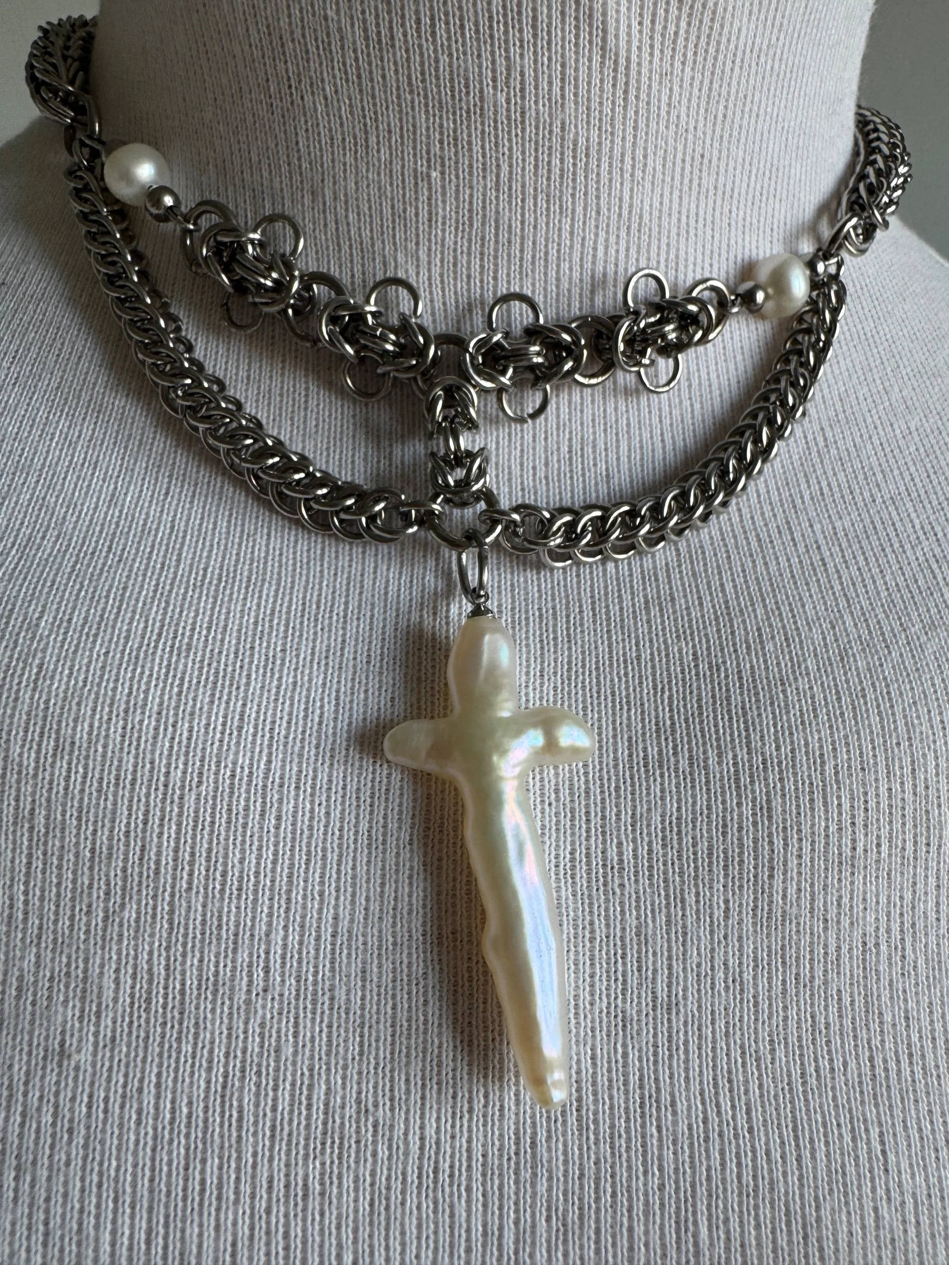Stainless steel links in full persian, byzantine flower and half persian weaves with freshwater pearls and a pearl cross pendant