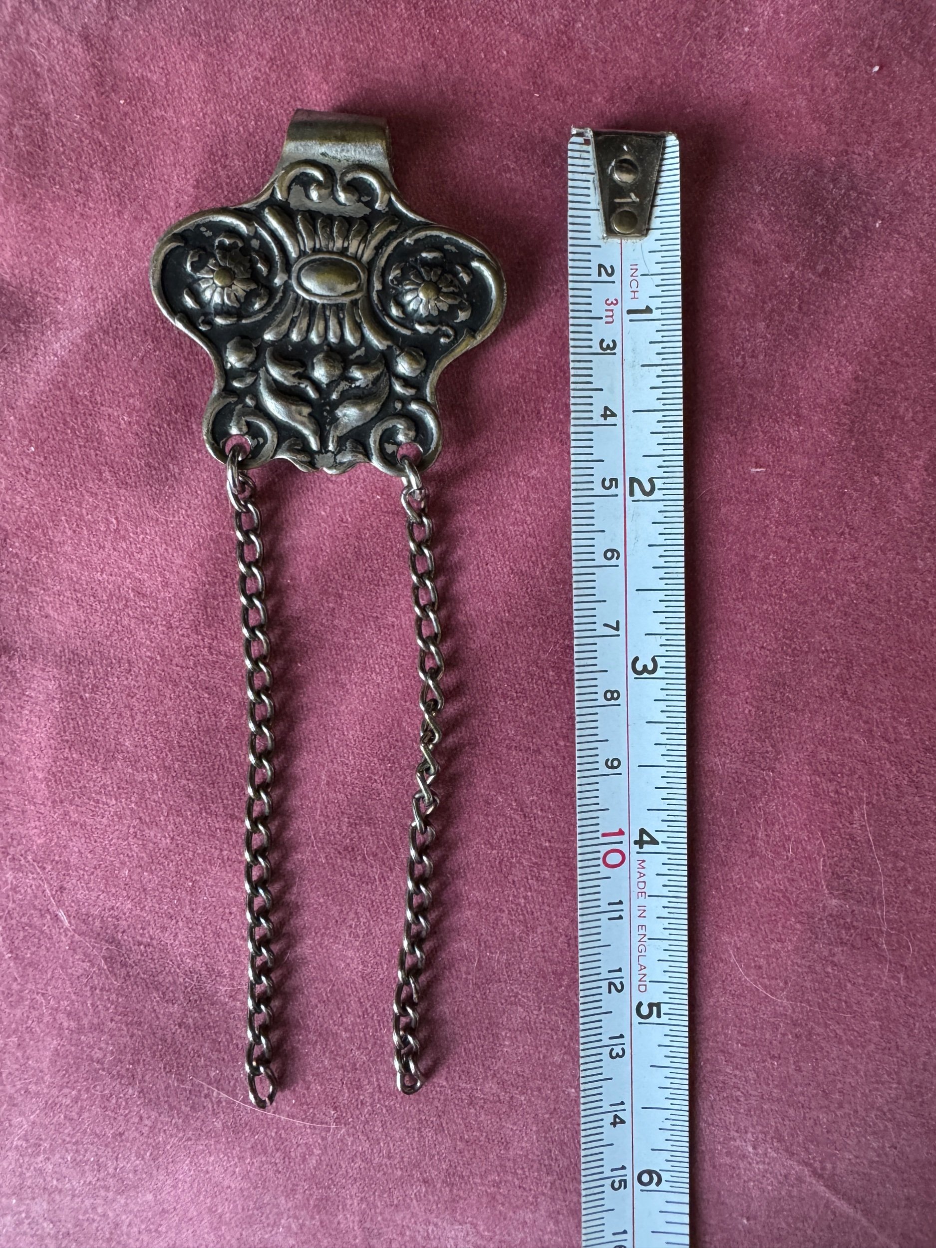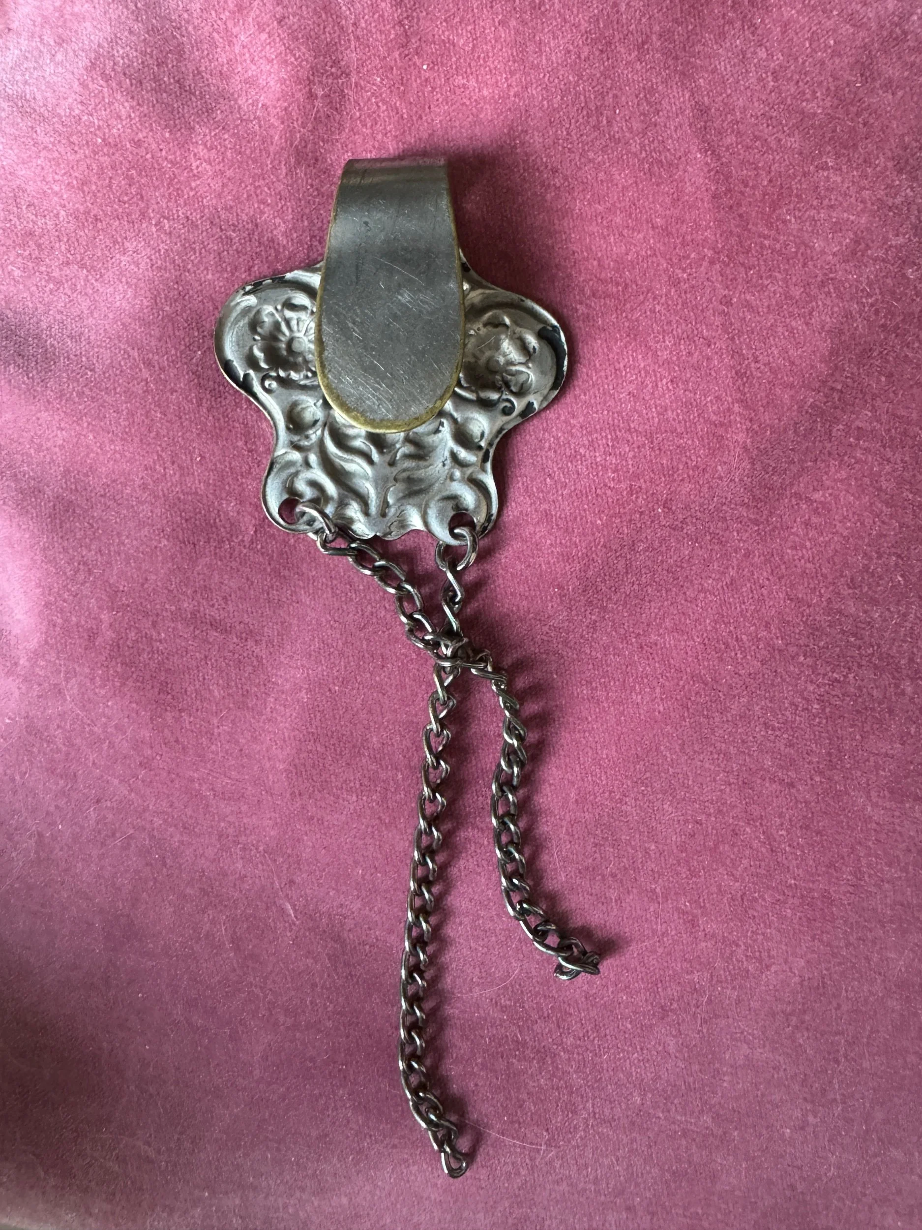 Shop › Flower Chatelaine Belt Clip Image 1 of 3 Image 2 of 3 Image 3 of 3 Flower Chatelaine Belt Clip £45.00 Antique belt clip with chains to add trinkets Add To Cart Added! Antique belt clip with chains to add trinkets